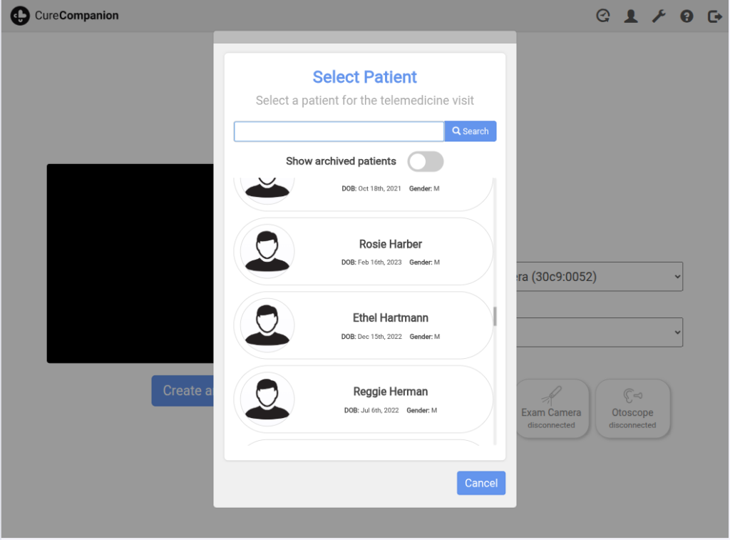 2. Search for and select the patient from the modal dialog, or create a new patient.