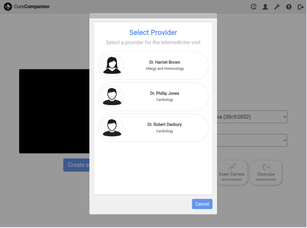 3. Medical Device Connectivity: View connection status of exam camera, otoscope, and stethoscope.