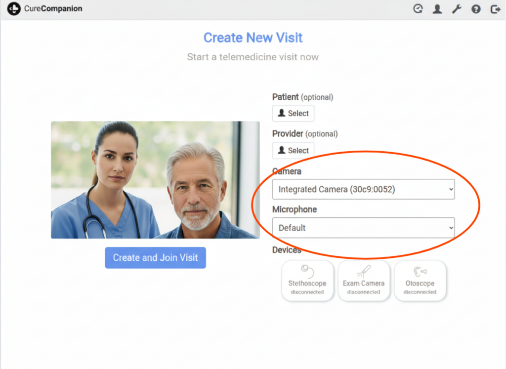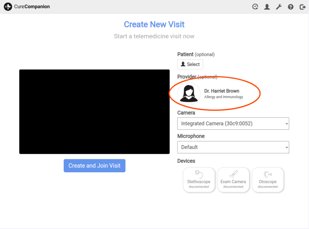 On the new visit page, you will see a preview of your camera and microphone. You can change your selected camera and microphone as follows: